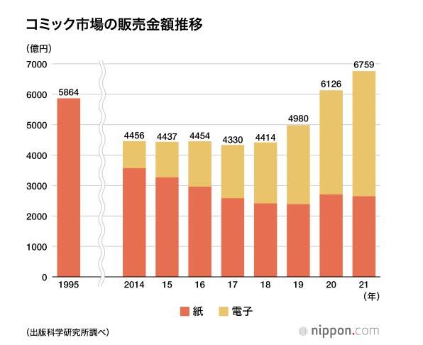 日本漫是一个相当大的产业,销售额也是非常可观。据日媒报道,根据日本出版协会的最新数据,日本漫画市场2021年总销售额约为6759亿日元,这个数据已经连续两年不断刷出新高,据分析主要原因是由于疫情导致居家不出,人们会选择浏览漫画。另外,随着各种电子便携设备的普及,各种电子漫画的销售大幅上涨,电子漫画的销售5年来翻了一番还多。