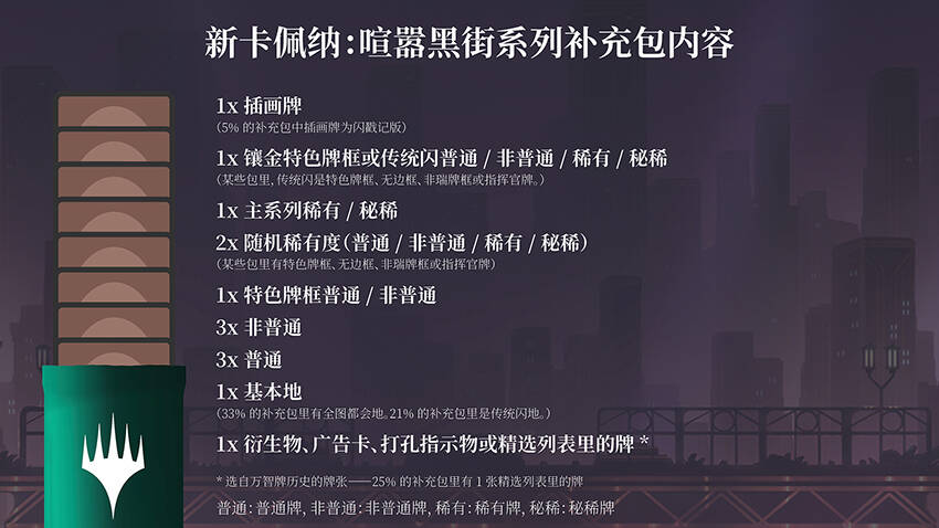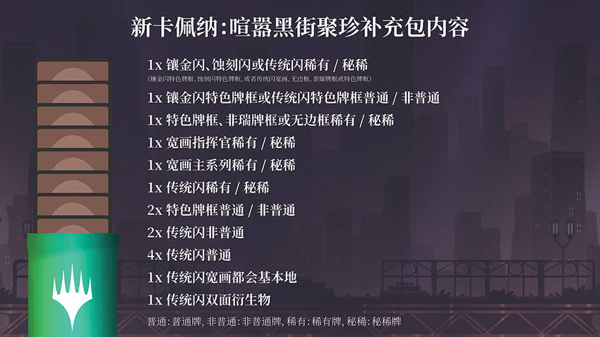 - 10张普通牌(在33%的新卡佩纳:喧嚣黑街轮抽补充包中,一张任意稀有度的传统闪牌会替代一张普通牌。)