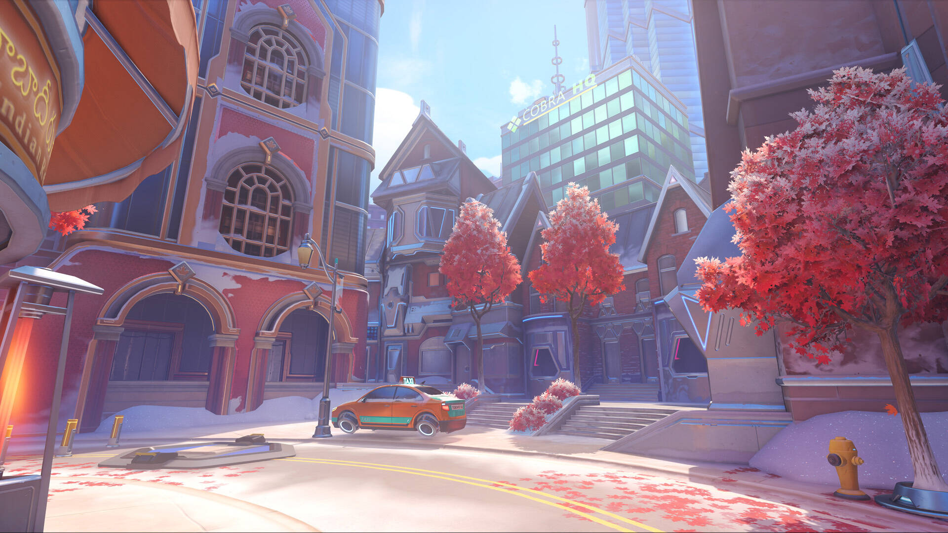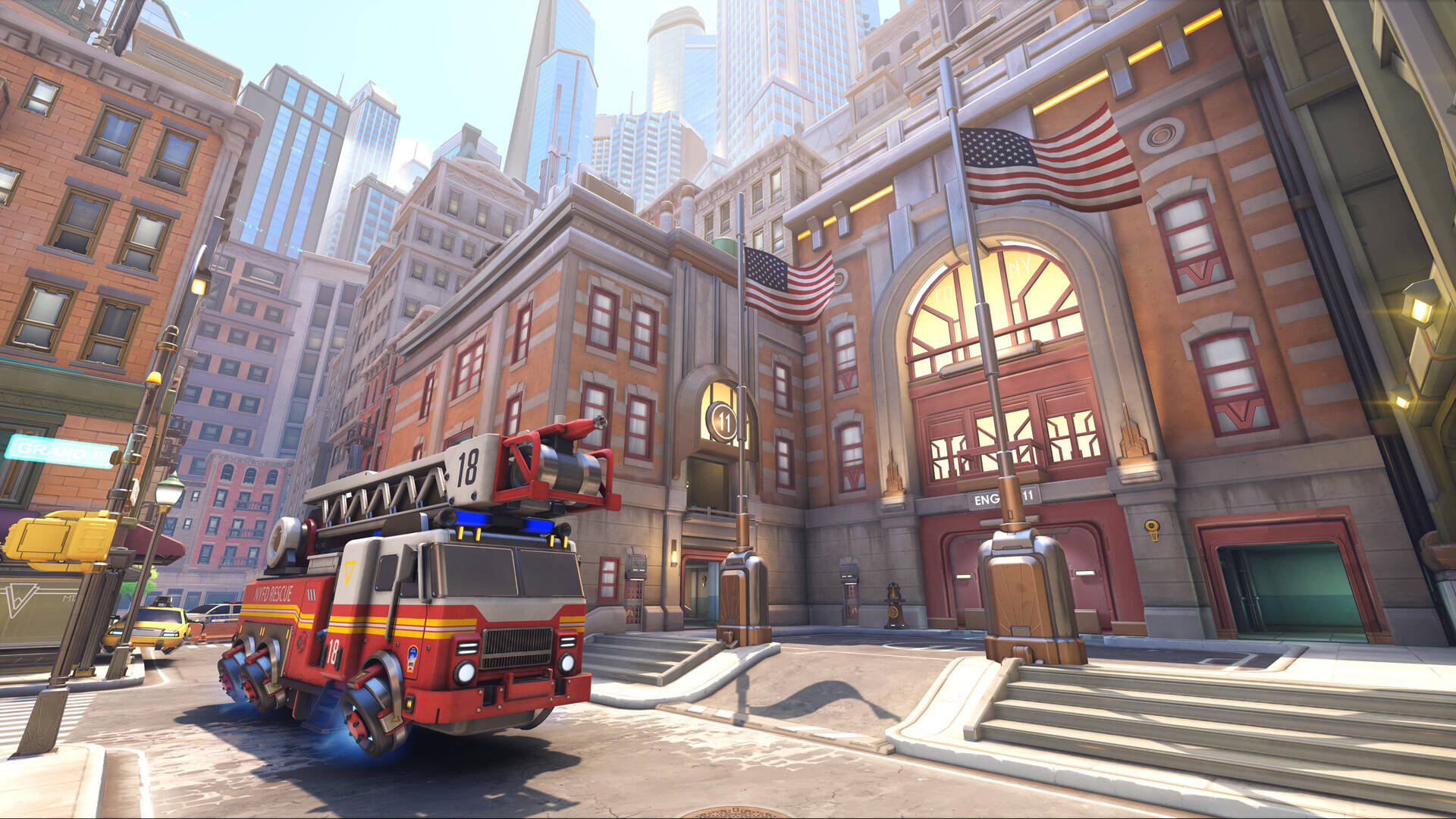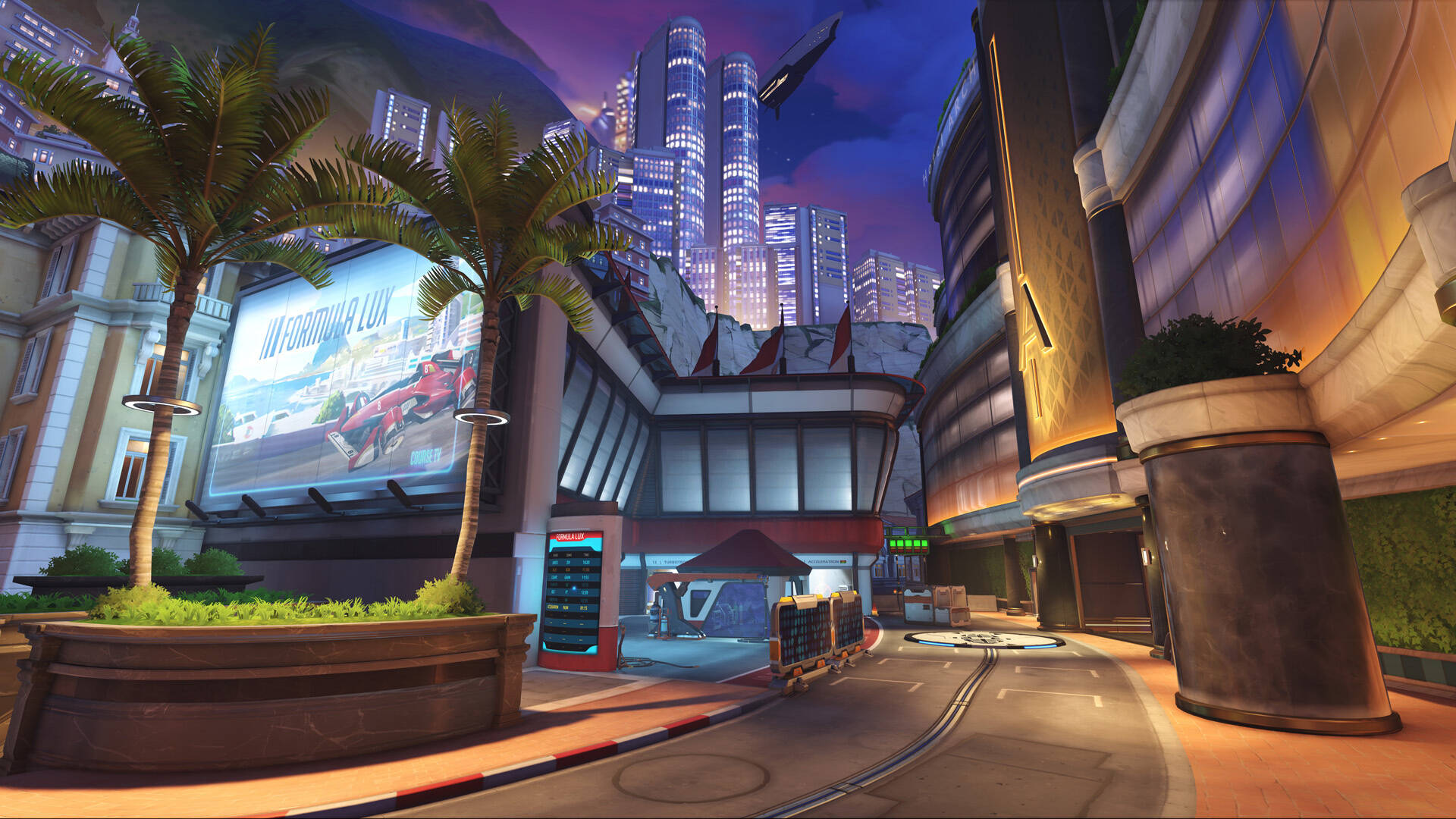 你也许还会在其他游戏模式中发现这种开发策略;全新的运载目标地图皇家赛道,以及攻击/护送地图中城,两张地图都巧妙地运用环境设计,用视觉效果指引玩家行动。Rogers进一步解释道:“我们会将目标点设计成地标建筑,例如中城的消防局和中央车站,从而凸显出这些点位。玩家一眼就能辨认出地图上的重要位置,让世界场景来引导游戏模式。”这种引导可以指引玩家抵达目标点或其他关键位置,例如皇家赛道的坡道连弯,这是一个险要位置,默契的团队配合足以在这里扭转战局。“连环弯道类似于战略要冲,能够营造的紧张的氛围,激励玩家发起团战。”Rogers如是说。“团结一心的队伍可以在这里畅通无阻,但你们必须步调一致。”