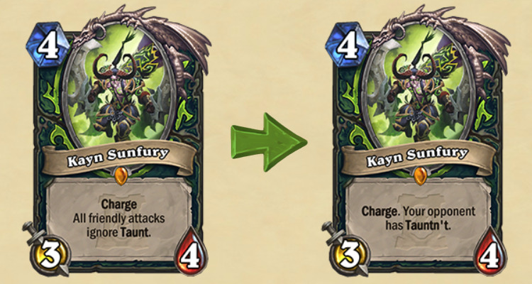 - 旧:冲锋,所有友方攻击无视嘲讽。 → 新:冲锋,你的对手获得嘲讽不能。