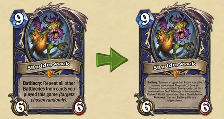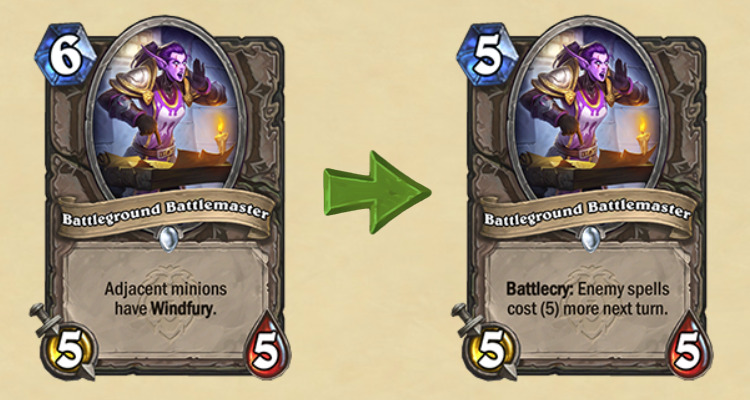 - 旧:[6点法力值消耗]相邻的随从获得风怒。 → 新:[5点法力值消耗]战吼:下个回合敌方法术的法力值消耗增加(5)点。