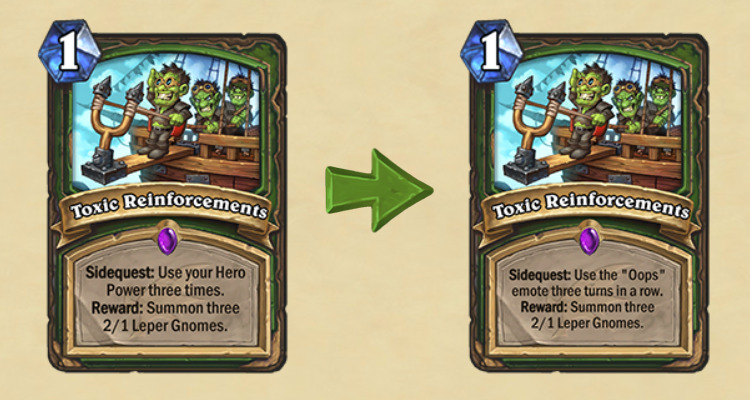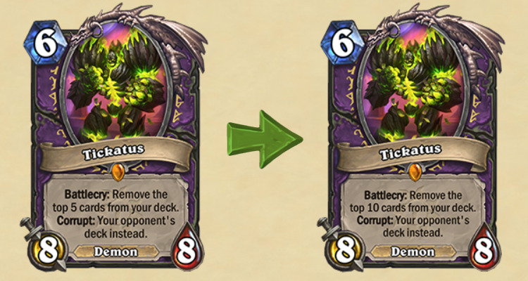 - 旧:战吼:移除你的牌库顶的五张牌。腐蚀:改为对手的牌库。 → 新:战吼:移除你的牌库顶的十张牌。腐蚀:改为对手的牌库。