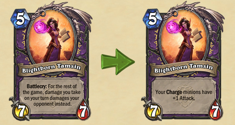 - 旧:战吼:在本局对战的剩余时间内,你在你的回合受到的伤害改为伤害你的对手。 → 新:你的具有冲锋的随从获得+1攻击力。