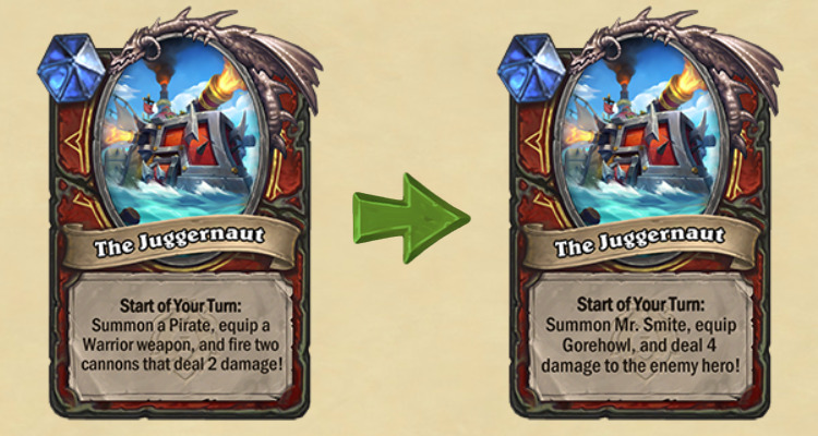 - 旧:在你的回合开始时:召唤一个海盗,装备一把战士武器,并向敌人发射两发炮弹,每发造成2点伤害。。 → 新:在你的回合开始时:召唤重拳先生,装备血吼,并对敌方英雄造成4点伤害!