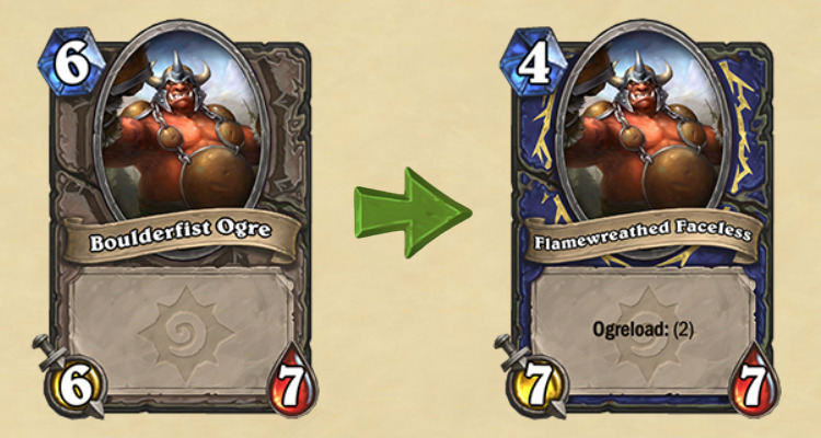 - 旧:[6点法力值消耗]6点攻击力,7点生命值。 → 新:[4点法力值消耗]7点攻击力,7点生命值,重命名为投火无面者,描述为“食人魔载:(2)”。