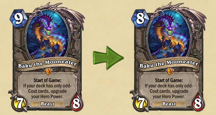 - 开发者注:巴库和吉恩应该永远是竞技狂野里的中流砥柱,可我们最近发现它们落后于更强的卡组形态了。对它们的这个加强应该能使这些卡组回归主流,使该模式生出新的可能。