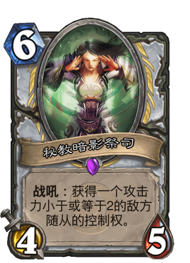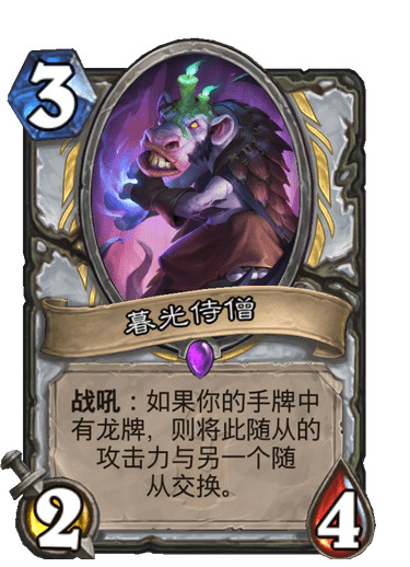 私心去讲,18年的牧师是我认为牧师控制卡组实力的巅峰。由于职业特性牧师很多设计思路是解场、回复、赖场buff,但在17年58相遇让牧师有了不同于圣光的胜利方程式。不过5本就大8一岁,18年5要升到更高的年级,不喜欢58在一起的长辈觉得分开,不够,他们让5改0换1,哼,方向变了,看你还怎么和8在一起。18渡鸦年中很多龙牌分散于各个版本,8重新集结龙族部队;以往龙族战吼于身材,龙牧也是通过一点点超模随从对于场面的滚雪球来踢死对手,可受限于职业特点,按费派怪很不适合自己,再加上本身过牌速度慢,抽一打一的境地往往是龙牧失败的主要原因,那如果我一张牌可以应对对手五张牌呢?先从上一年的狗头人:暮光侍僧上限控制对方后期一个大怪,还可能反踢到对面,下限也可以把对手前期3、4攻的随从吃掉;破晓龙,火热促销的发明者,牧师所有牌中算前十的存在,一句多管闲事的虫子对无数快攻玩家造成精神与场面的双重打击;