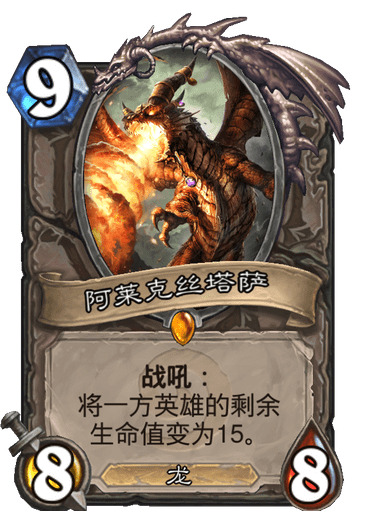 那快攻少了,怎么取胜另一端的后期卡组呢?总不能靠自己这些本就亏攻击力的随从吧,没有,自己的随从可以不用打伤害,龙族里的红龙女王阿莱克斯塔萨能直接压对手血线倒15!然后下回合3震爆2技能或者3技能2震爆,足够斩杀对手(除非对手是能回复的职业)。