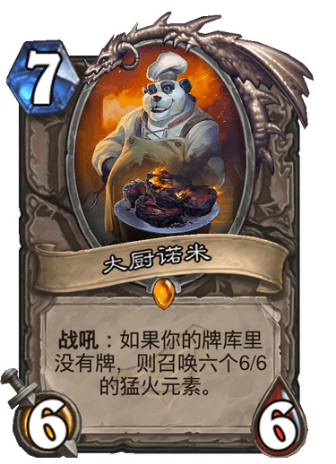 发动效果可召唤满场的66元素,条件需要牌库无牌。纵观炉石历史这样把牌库整没的卡,大家一开始都会持瞧不上之态度,可一旦相关的卡组被发明出来,一张卡便是绝杀无解(除了术士。术士玩家请把对手牌库整没,别老惦记整自己的)一些过牌上优势的职业,如:德鲁伊、盗贼纷纷拿出大厨卡组,然而让人意外的是,乐呵呵地抱着自己复活&大哥组件的牧师,奇兵突出,拿出了大厨牧,这是牧师在TNT上最后一次击碎对手的过牌卡组。大厨牧除了北婊过牌+炎术士解场这对组合,还带了加基森,平常来说牧师很难用加基森过牌,不过大家可以看一下所有职业0费法术的数量,