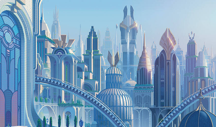 在这座城市的另一边是个缺乏自然与生命,残破不堪的时空。在它的城牆内是一个人造的钢铁大都会。一座工业殿堂。在建筑内部发现的图案已经够自然了。薇薇安能够在扇形窗户裡分辨出棕榈叶的形状;经过锤打与抛光的金属让人想起了瀑布。不过当出现真正的绿色植物时,它却被封存于水泥与钢铁中,被仔细地凋塑摘採以形成类似许多市民衣着上的锯齿状图案。