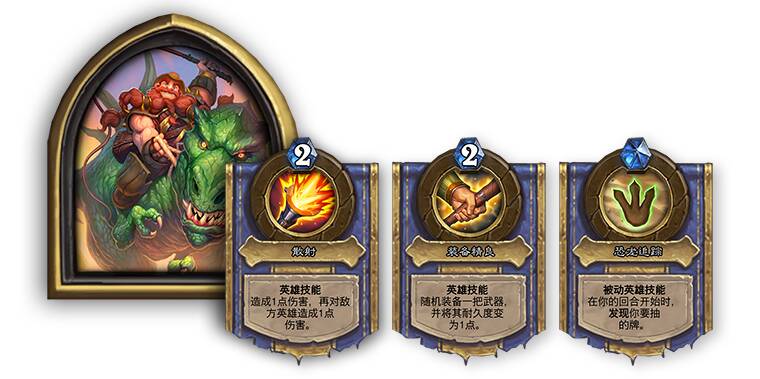 - 招牌宝藏1靠谱的老猎枪,3费4/2武器,在你的英雄攻击后,对所有敌人造成1点伤害。