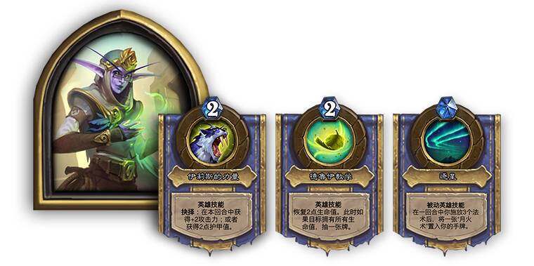 - 技能2德鲁伊教学,2费,恢复2点生命值。此时如果目标拥有所有生命值,抽一张牌。