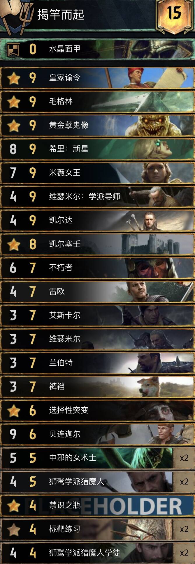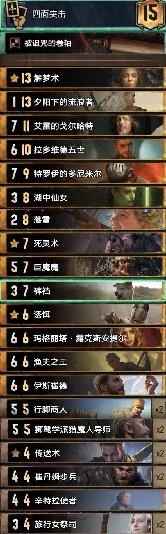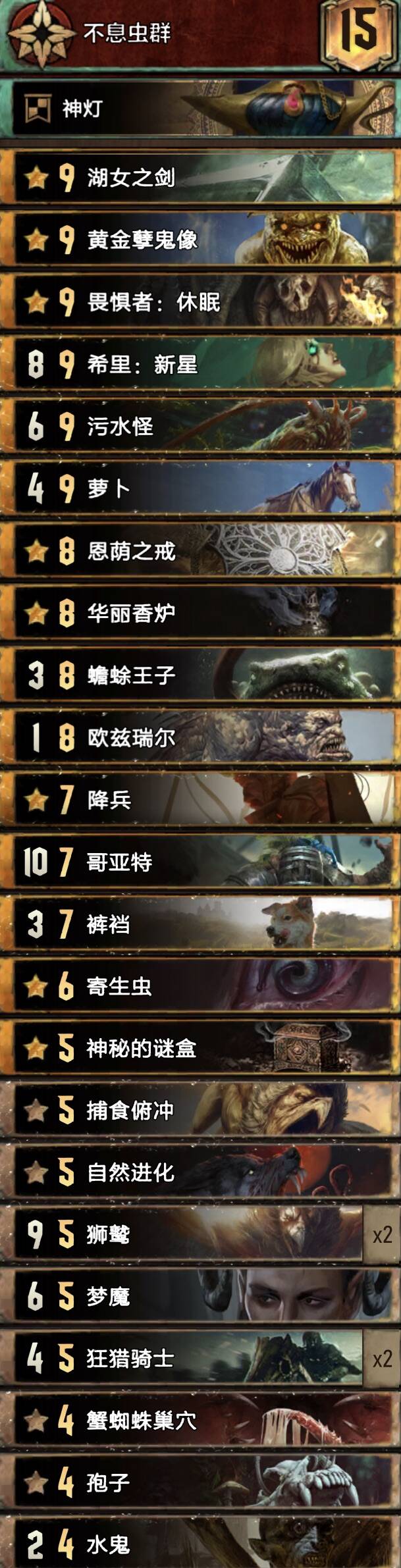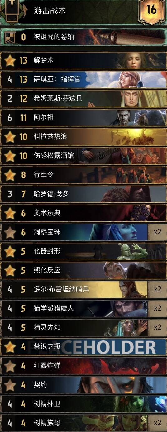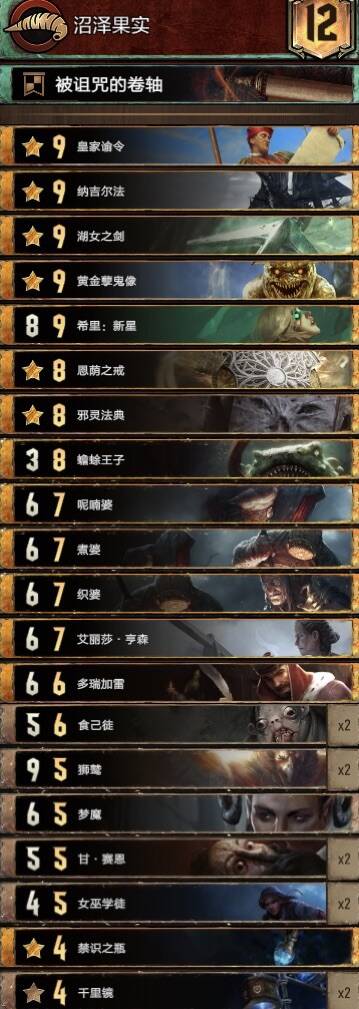 中长局比别的希里卡组更强,猎魔人体系铺场很快,配合米薇女王长局点数很大,卡组携带了不朽者女术士一套方便拿下r1,孽鬼要开完3基佬再开。