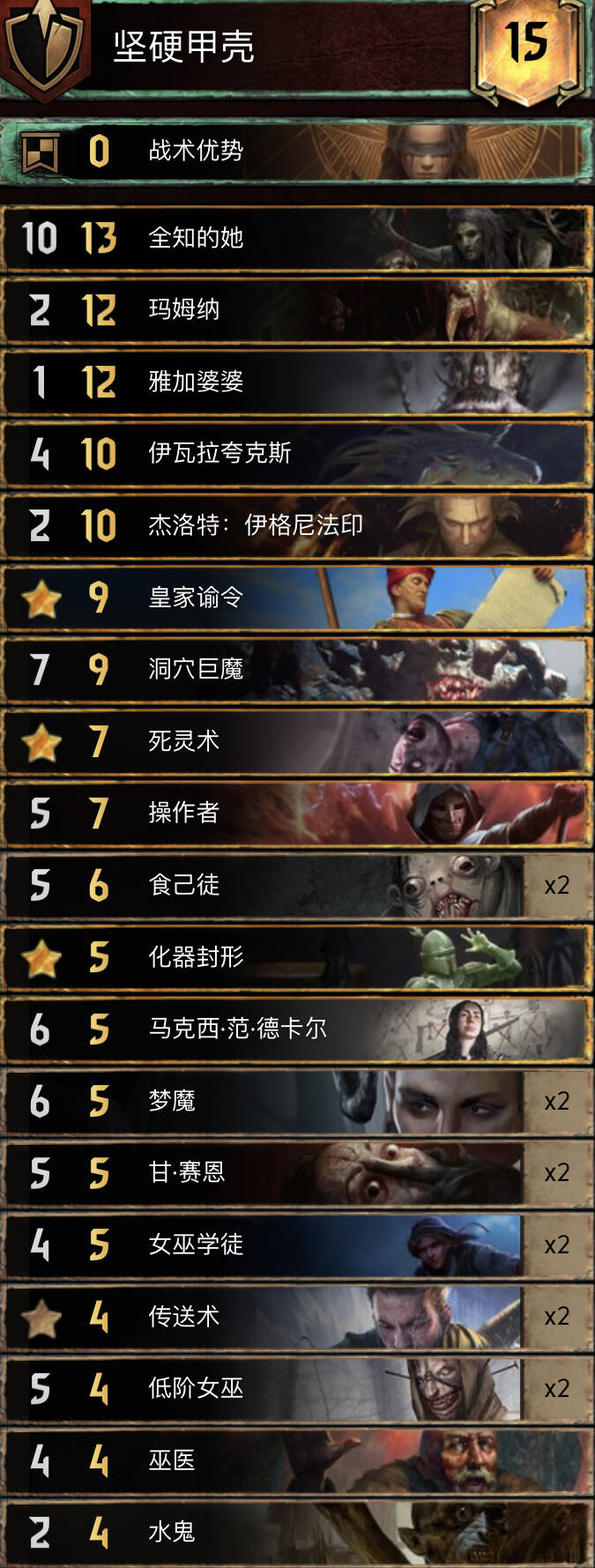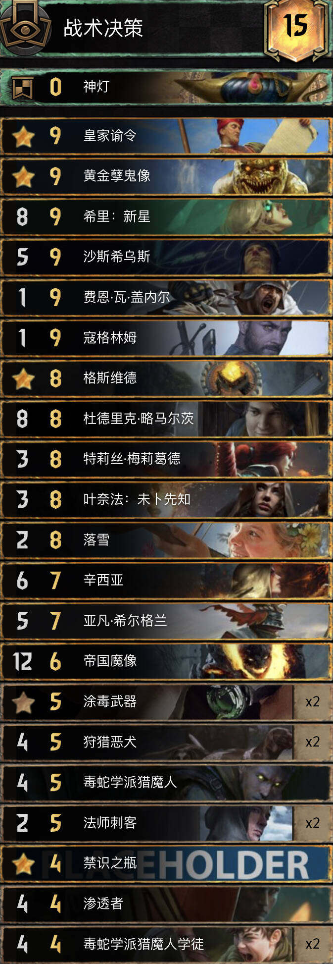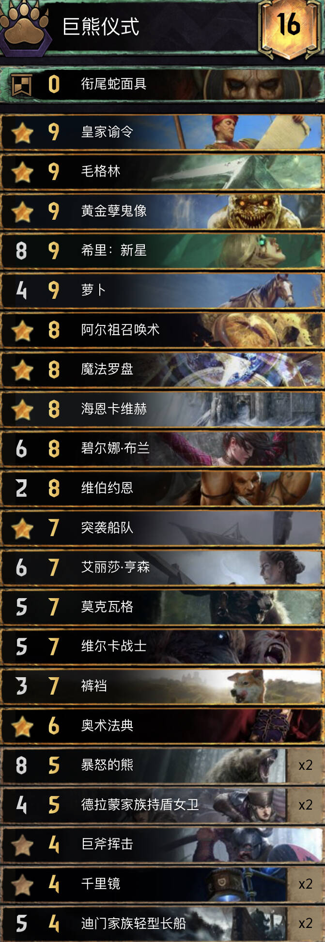 中长局比别的希里卡组更强,猎魔人体系铺场很快,配合米薇女王长局点数很大,卡组携带了不朽者女术士一套方便拿下r1,孽鬼要开完3基佬再开。