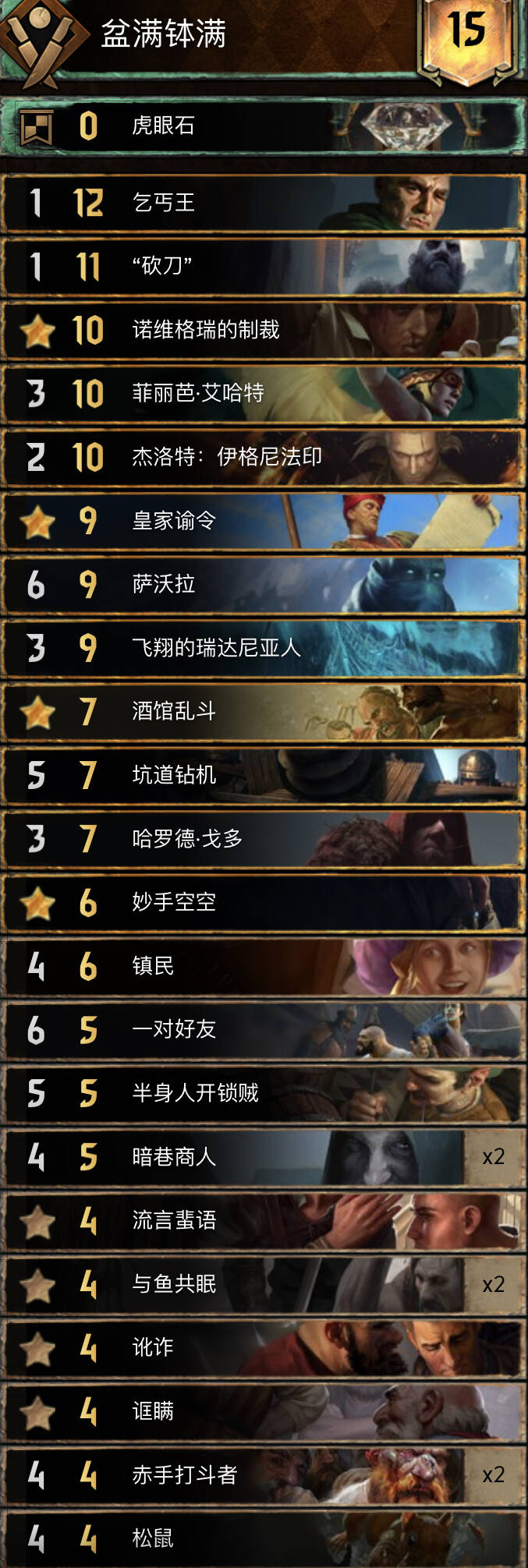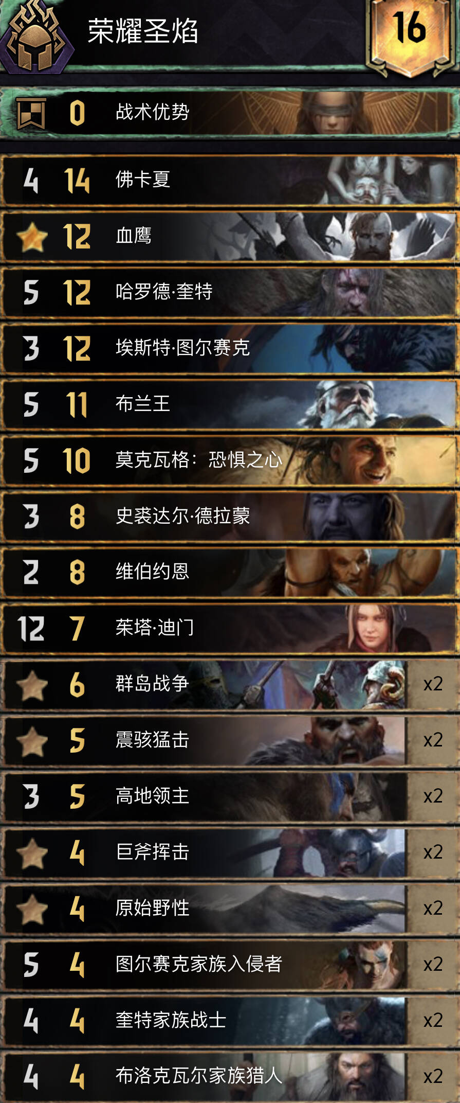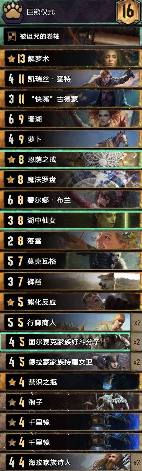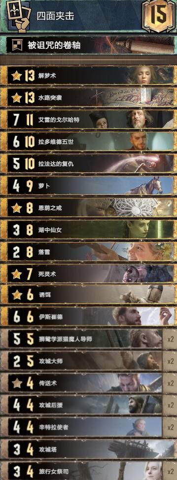 赢r1,r2逼,短r3。亏一卡进r3也能赢。湖女检索回响,都在手里可用卷轴,换牌,或领袖换回去。拉多维德最理想r1交,遇到能解的阵营工程兵给狂热。大法师基本选传送。萝卜滤牌和加强r1能力,让换牌和诱饵更稳定。拉发达过牌,萝卜越早在手越好,不要贪额外存3点,滤牌第一位。戒指加强r1能力,这张牌会很大,一般十几到二十点,走了也能帮滤牌。