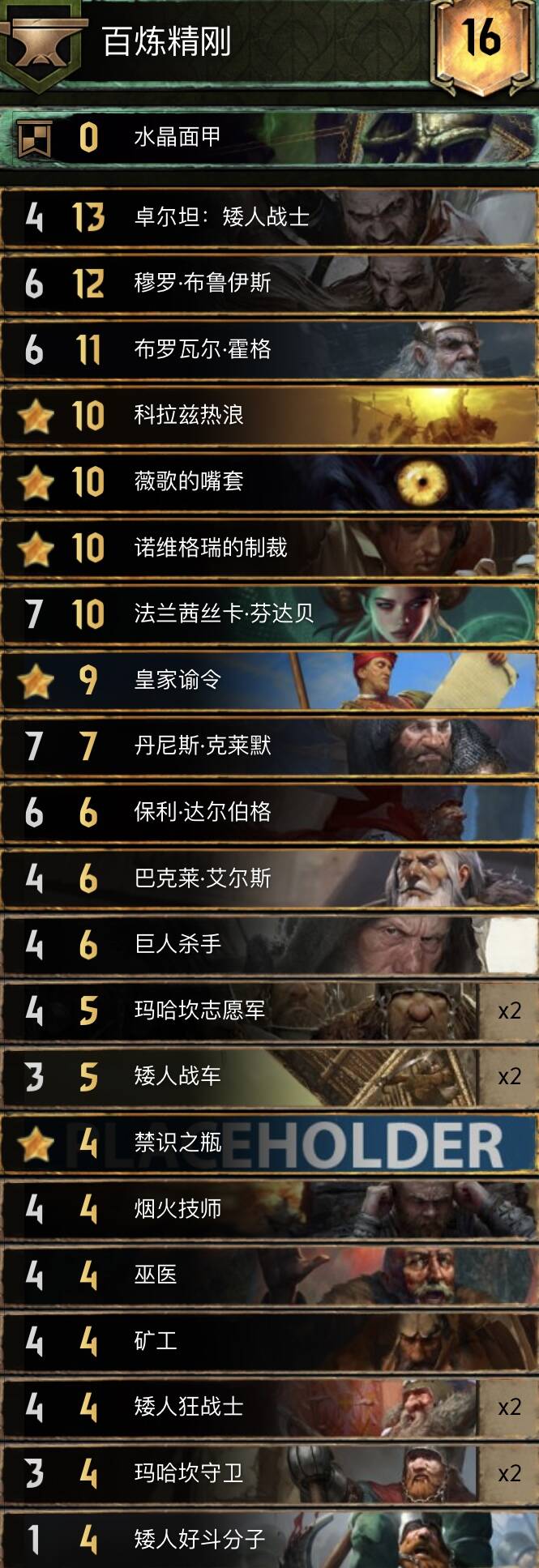 赢R1,R2手牌好直接下矮人王逼牌,R3如果有的话矮人的点数很大概率能赢。其中13p卓尔坦作为一张点数超大的大金,可以在R1抢节奏抢平卡,也可以留到R3终结,属于非常灵活的卡位。岳父可以在R1交,配合护甲师工坊能立马提供12点护甲,再加上矮人自带的护甲,基本上7p7的丹尼斯一卡20+,爆点十分恐怖。巨人杀手最好R1配合好斗分子,其实巨人杀手最好还是标5点以上,因为能提供4点护甲还是很有用的,且有好斗分子在很轻松能致死。