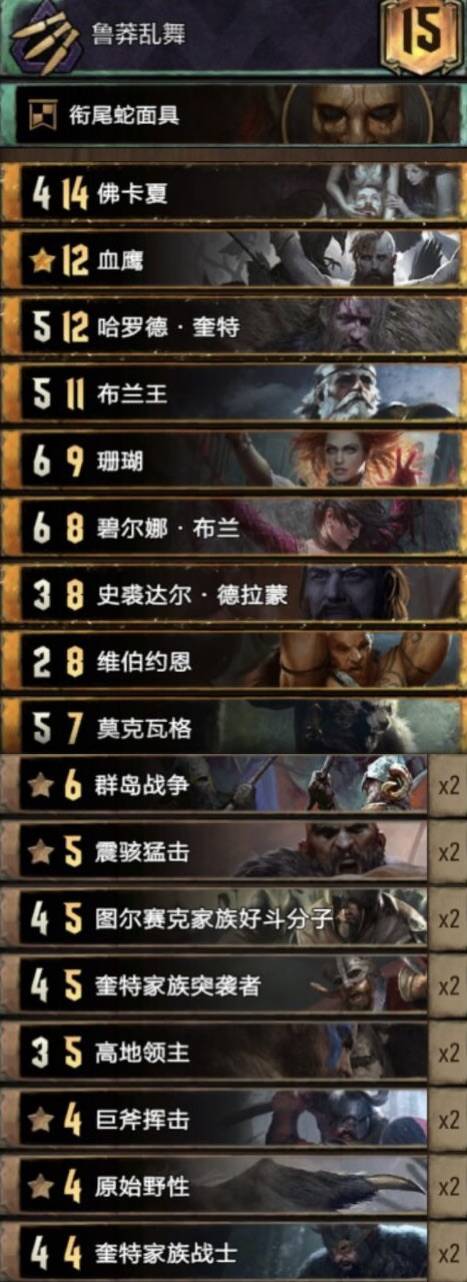 战术是面具,领袖是鲁莽乱武,这套加入了弃牌体系,加上血鹰,不怕鬼抽,4p的奎特战士不亏点,还可以弃掉,配合群岛战争,最少打7简直离谱,佛卡夏可以拉领主,还可以拉德拉蒙,都不亏,我试了暴打帝国,矮人,和涎魔,解个精光,自己还有硬点数,伤害溢出还有布兰王,现版本一哥,真正的奎特岛来了。