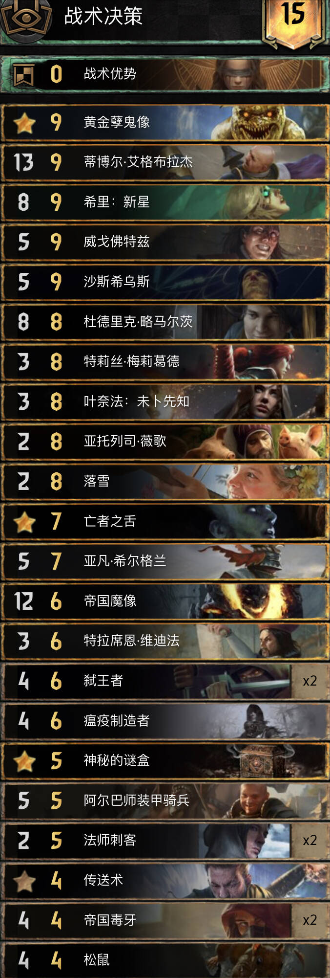 R1先手用传统方法发育,尽量每种铜卡单位都打出去一次。后手就用黄金孽鬼雕像爆大点。打6老巫妪、多瑞加雷和蟾蜍王子留给对面引擎。有恩荫之戒在,尽量拿下R1。