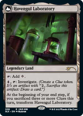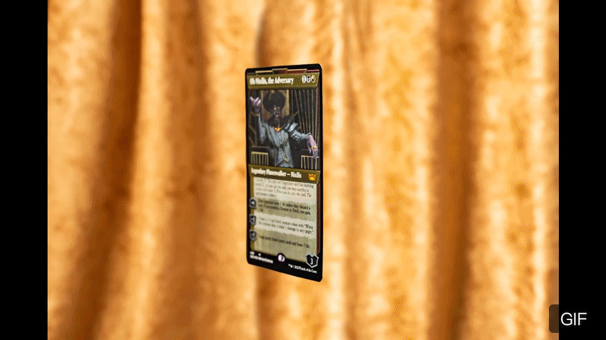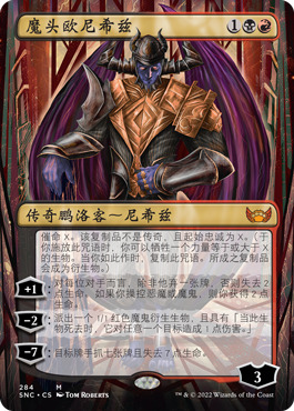 当魔头欧尼希兹听说黄金时代牌有终极炫酷的镶金版本后,他想知道自己的那张艺术装饰牌的终极炫酷版本在哪里。幸运的是,他听说全部九种艺术装饰牌都有蚀刻闪版本且只能在新卡佩纳:喧嚣黑街聚珍补充包里开到后感到很满意。