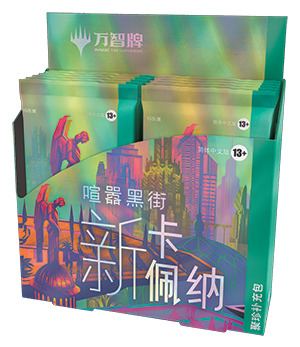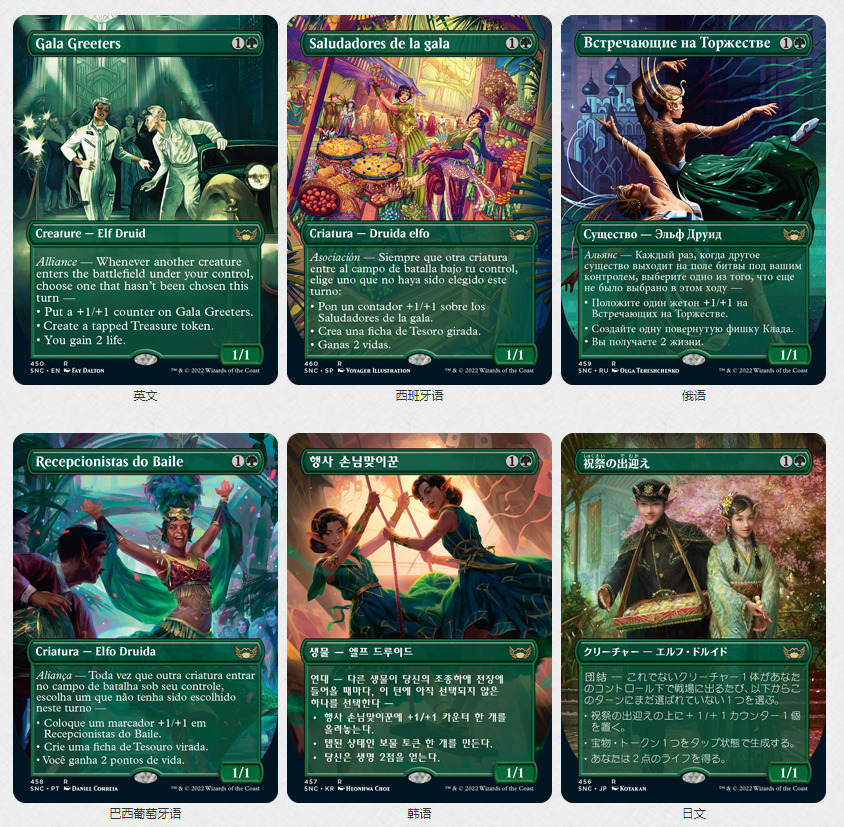 这些是新卡佩纳:喧嚣黑街的地区特有盒顶赠卡。系列补充包展示盒内含30包系列补充包,每盒都有一张传统闪盒顶赠卡,类似的,轮抽补充包和聚珍补充包展示盒里也都有盒顶赠卡。这张牌不会变,都是晚会招待,但是晚会招待的插画和语言会和展示盒的语言相匹配。