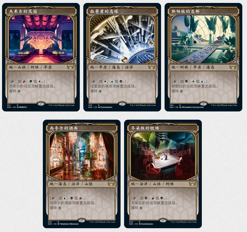 在系列、轮抽和聚珍补充包里,你有机会开到黄金时代、艺术装饰、摩天楼、非瑞克西亚和无边框处理,传统闪和不闪的都有。镶金牌只能在系列和聚珍补充包里开到。蚀刻闪版本的艺术装饰牌只能在聚珍补充包里开到。镶金牌只有英文版,不过可以在任何语言的补充包里开到。在系列和轮抽补充包里有机会开到传统闪或不闪的都会地。每包聚珍补充包里都有一张传统闪都会地。