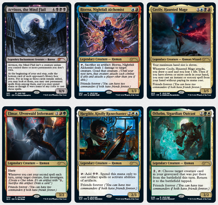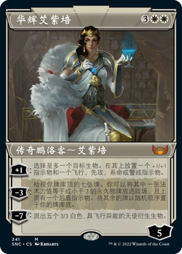 在聚珍补充包里,你还有机会开到新卡佩纳:喧嚣黑街指挥官系列的宽画版。在新卡佩纳:喧嚣黑街里共有80种这类的稀有和12种这类秘稀。新卡佩纳:喧嚣黑街指挥官系列里大多数牌的宽画只有不闪的版本。不过,新卡佩纳:喧嚣黑街指挥官套牌里的全部10种新秘稀传奇生物以及6种稀有和2种秘稀新卡佩纳:喧嚣黑街指挥官牌都能在系列补充包里开到,它们在聚珍补充包里有传统闪宽画版。