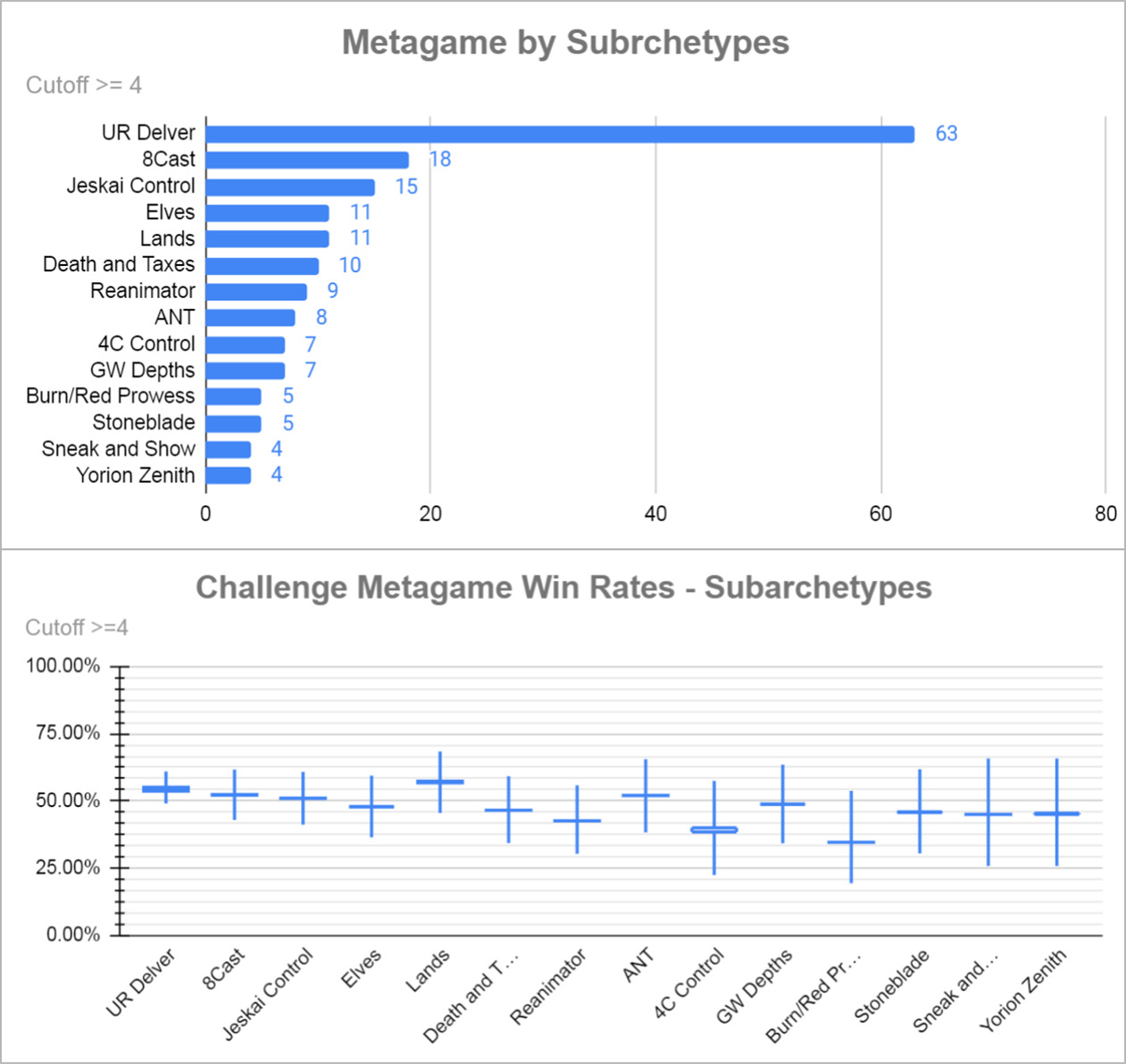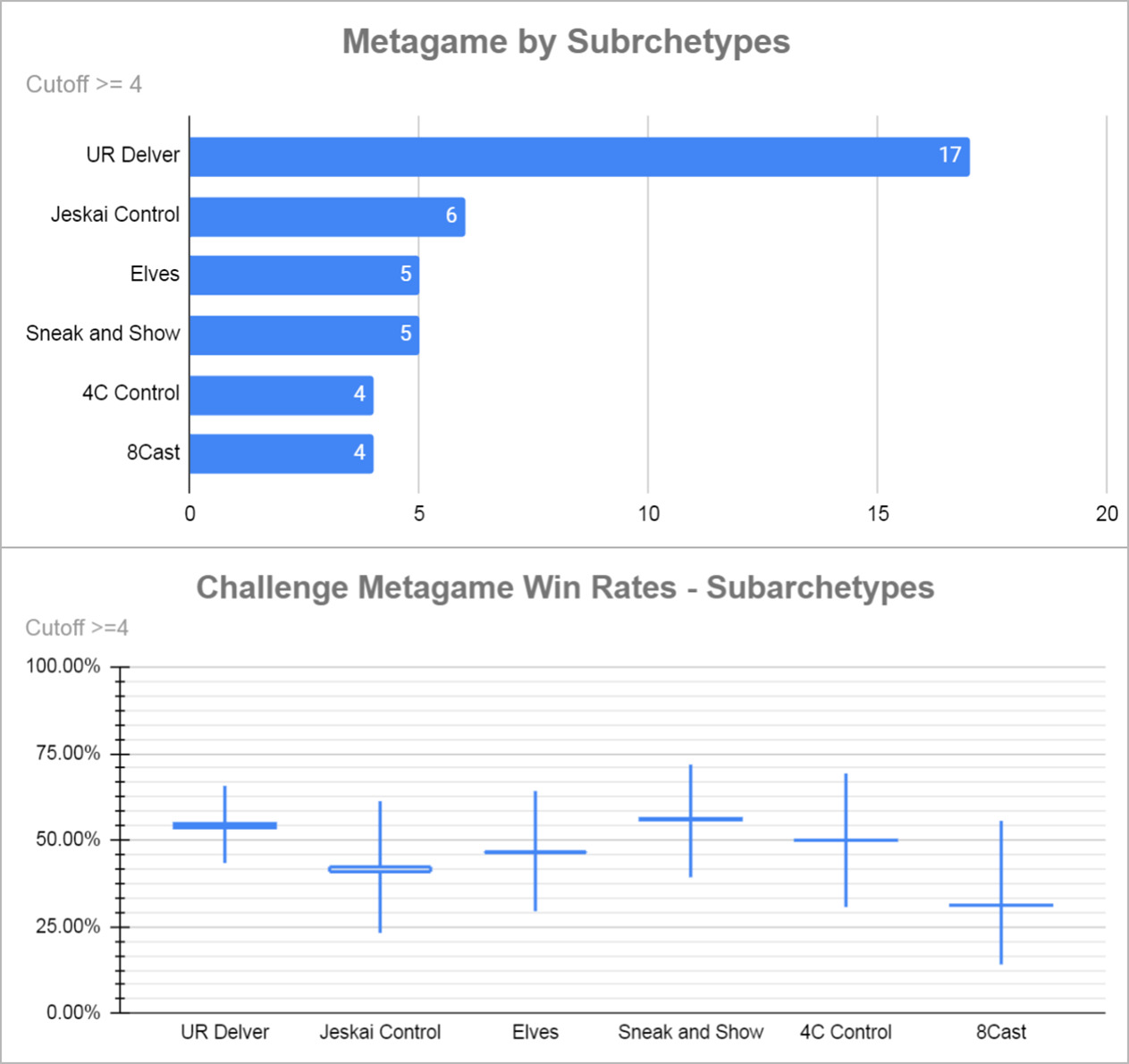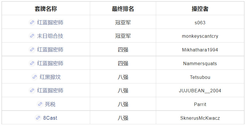 红蓝掘密师在比赛中的主导地位显而易见,占比接近25%,非镜像胜率接近60%。下一个最受欢迎的套牌是8Cast,表现一般。再下一个是洁斯凯控制,表现稍差