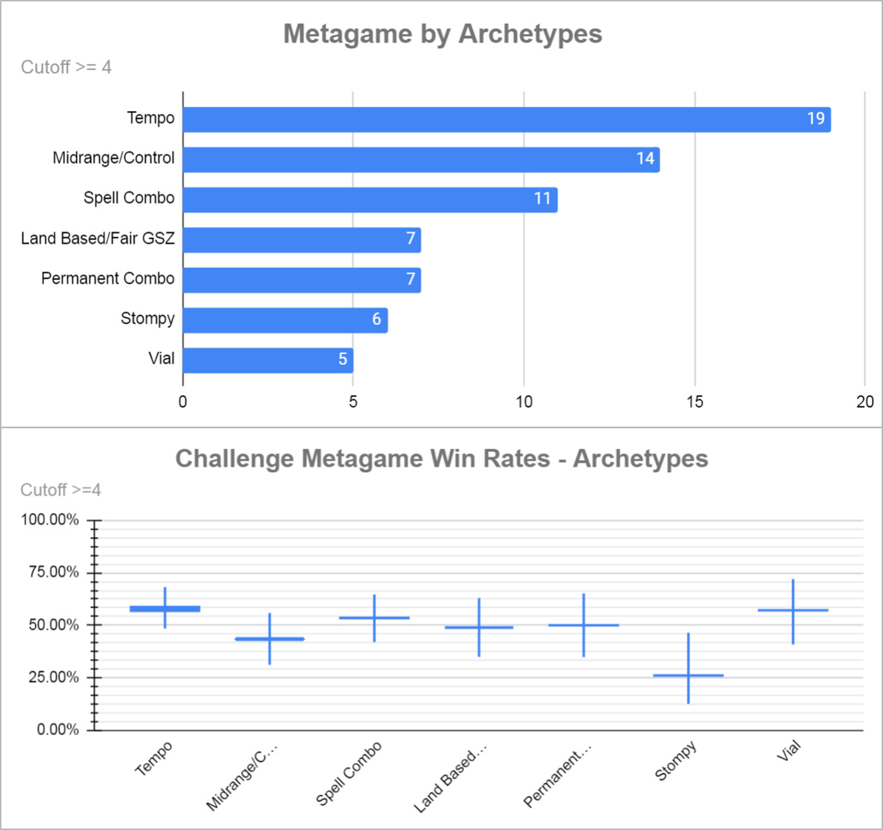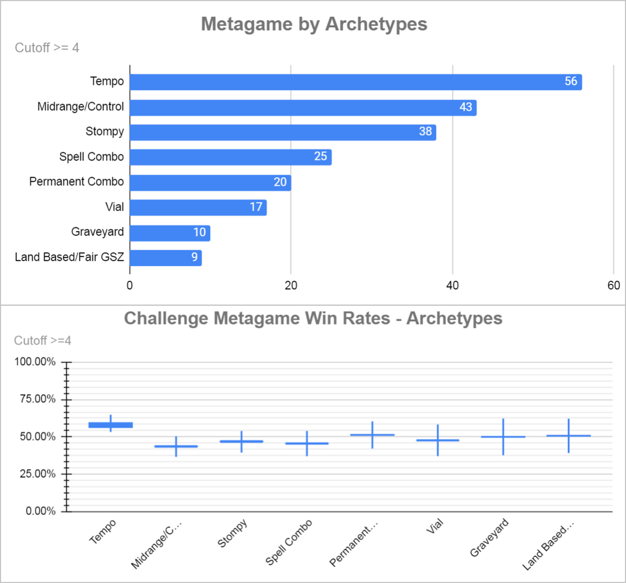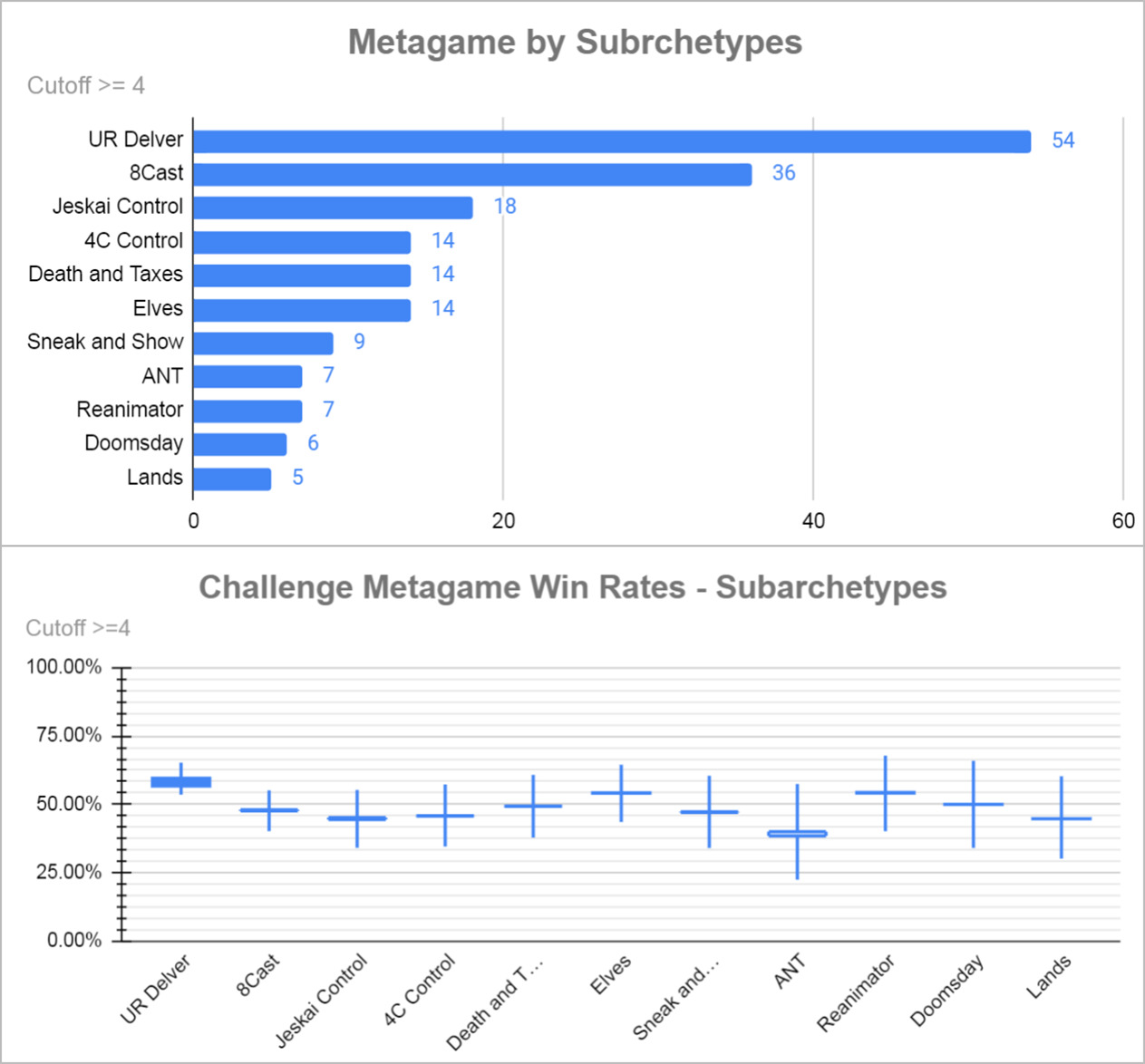 红蓝掘密师在比赛中的主导地位显而易见,占比接近25%,非镜像胜率接近60%。下一个最受欢迎的套牌是8Cast,表现一般。再下一个是洁斯凯控制,表现稍差