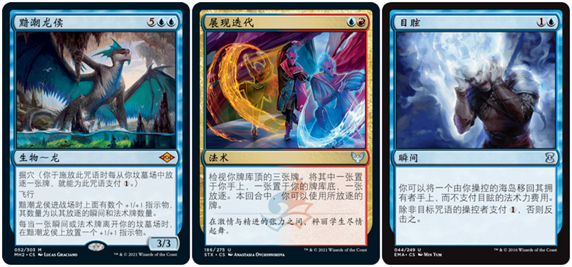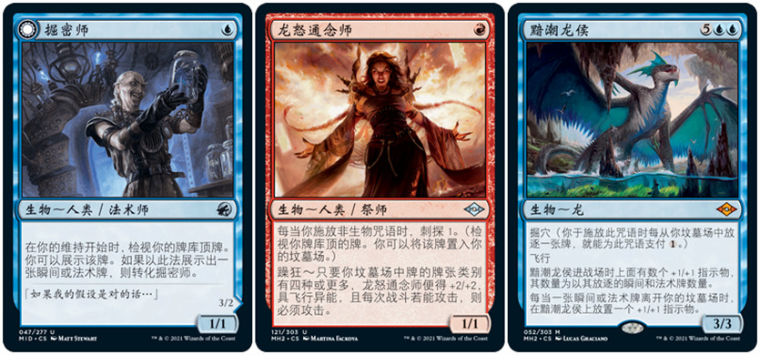 我认为应该关注近些年来被添加进红蓝掘密师的几样新卡。其中黯潮龙侯是一个非常厉害的新威胁,并且用起来很简单。操控者只需打空手牌,就能收获一个强大威胁,进而赢得比赛。黯潮龙侯还具有飞行的穿透能力,其最后一条异能会让它在场上继续成长