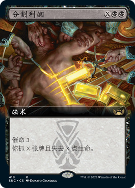 第二张预览牌也有一个富有风味的名字,但它不是顶底设计,而是先有了一个很酷的机制后来才把牌名加上去。在洞察设计裡,我们列出了一个有着很酷牌名很长的清单,所以当设计出一张我们喜欢的牌时,就会检视那个清单还看看有没有任何适合的牌名。在说了这些后,一起来看分割利润。