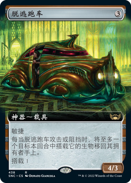 这张牌是从牌名而来的顶底设计。背后的概念是我们希望脱逃跑车能轻易地被搭载,因为在脱逃时你往往只有很短的准备时间,但那代表得要有搭载以外的其他费用。把一个搭载的生物弹回手上是一个很有趣的设计,因为系列裡有很多其他方式能把费用或副作用转成正面的效果。