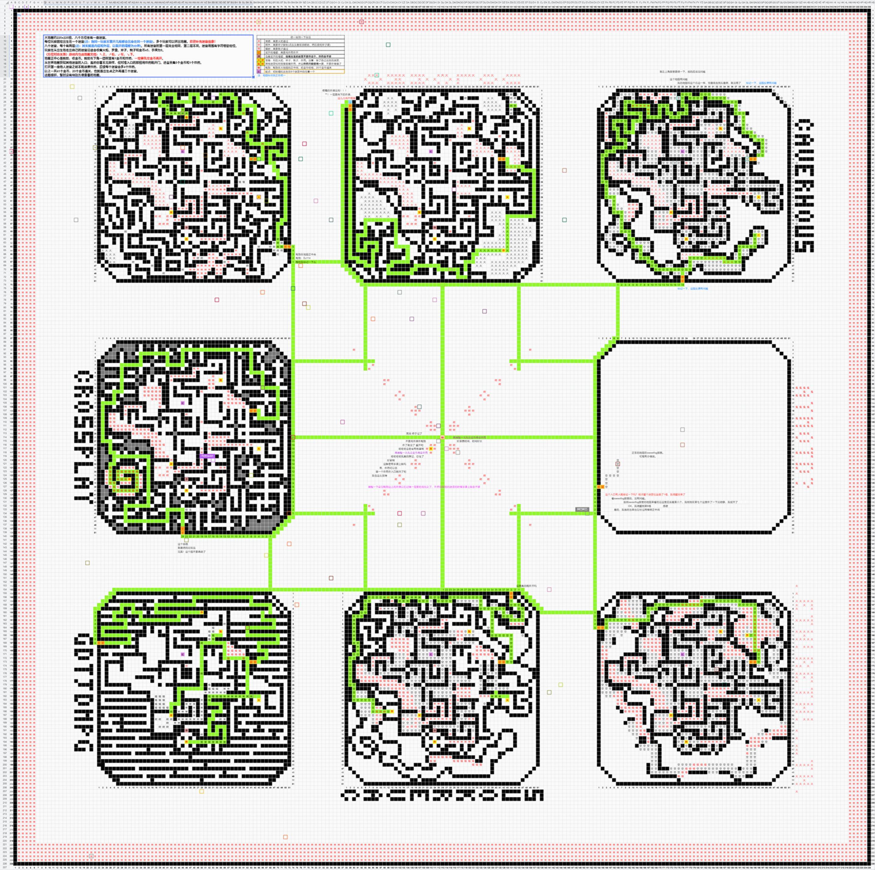 由于不同玩家会出生在不同的房间或者说迷宫里,人们需要通过合作拼出整张地图,然后才能进得了其他迷宫,所以我想给玩家一些标识物,也就是每个迷宫的名字。所以我在地图上画出了各个迷宫的名字,比如“CAVERNOUS”迷宫就满是洞穴,“SUONREVAC”迷宫则不仅名字反过来,迷宫的很多地方也是反了一反的。