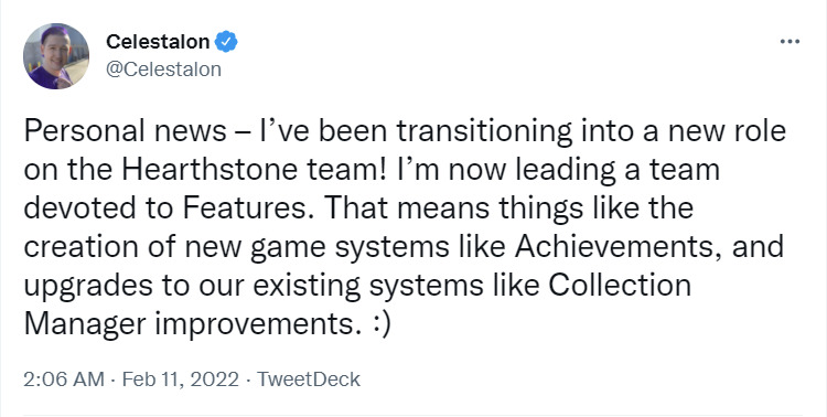 Celestalon:这个嘛,我爱炉石,我爱炉石的社区,能为炉石工作我也很高兴。