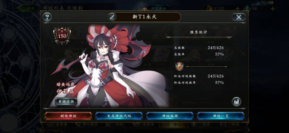 这是我这个版本永火鬼全程上gm的战绩,用了426场的场次245胜场最终结束了这次gm之旅,而构筑也是一直在变,由于我没有更换deck所以胜率也是最终锁定在57%。这是我最终确定之后的构筑