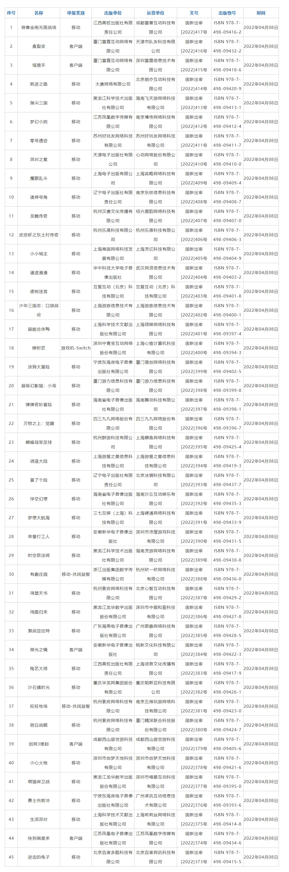 4月11日晚 来自国家新闻出版总署的官方公告:2022年4月份国产网络游戏审批信息公布。