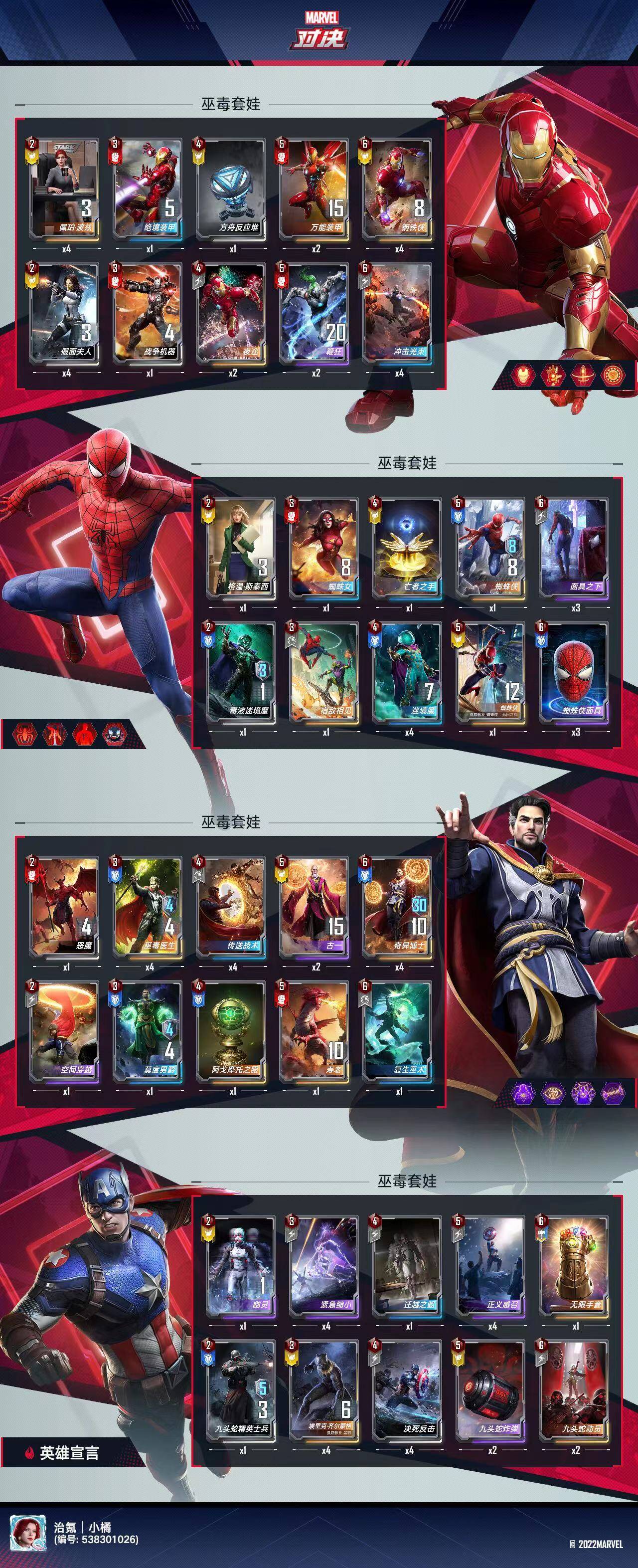 一号位带盾迷境魔,二号位荷兰弟,三号位巫毒带蜘蛛面具,四号位古一,五号位钢铁侠/九头蛇角色带致狂炸弹,六号位莫度