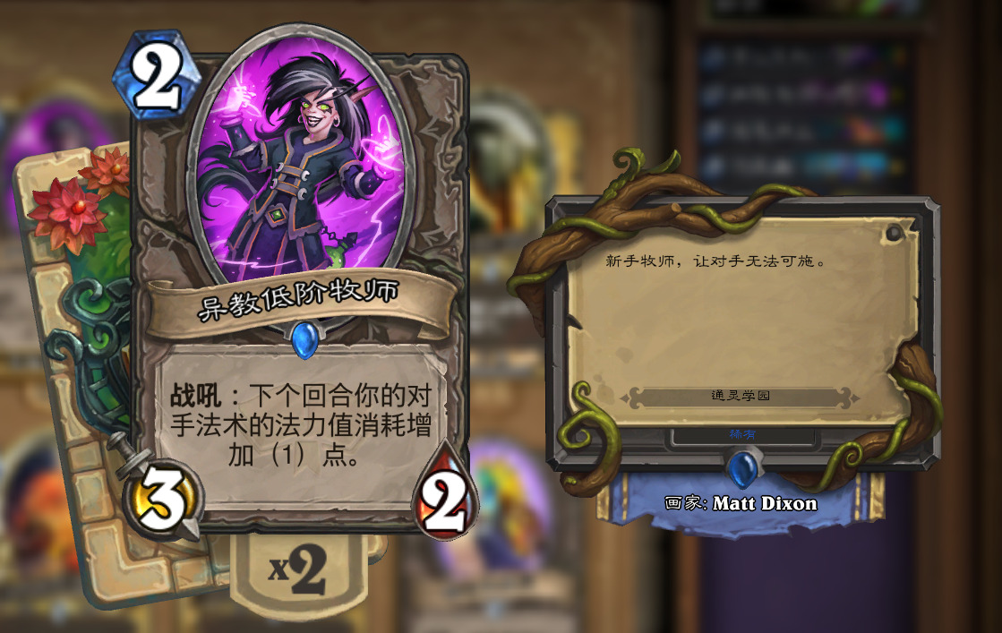 第二张,凯子德杀手蟹 异教低阶牧师,仅仅是一张2费的牌,具有一点都不亏的身材,就能将凯子德的启动回合直接延后一回合?!异教低阶牧师,我的心肝宝贝,具体使用方法放到后面说。