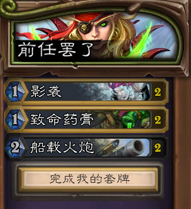 那就要把目光放到凯子德和黑猪牧上了,因为剑鱼需要一定的海盗作为触发条件,所以说我们不能扔掉任何一个海盗来降低这至少6点伤害,而秘密通道和劈砍课程作为刀贼非常优质的过牌,也不能舍弃,那么能换掉的,就是这些了: