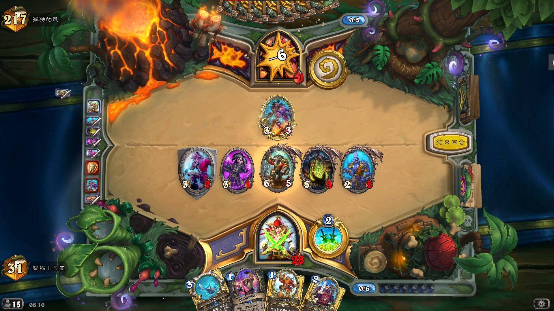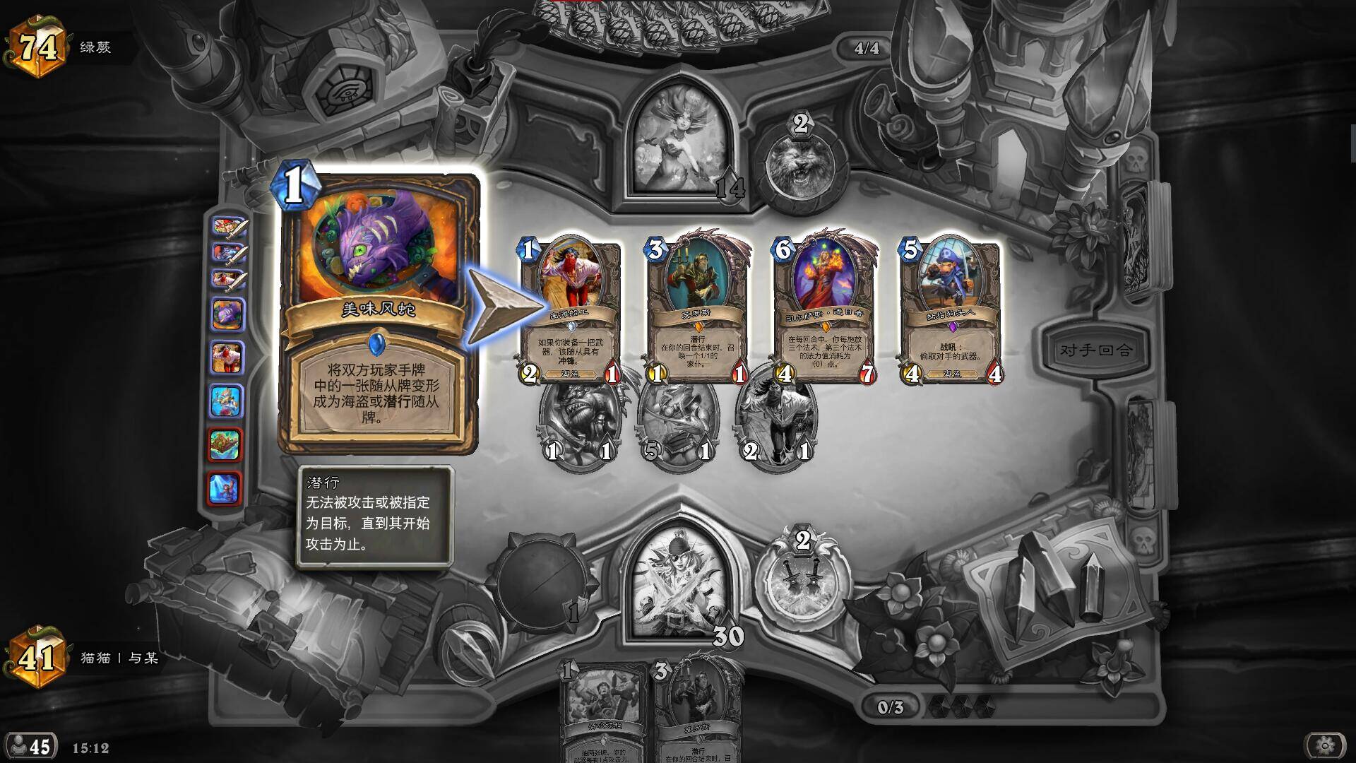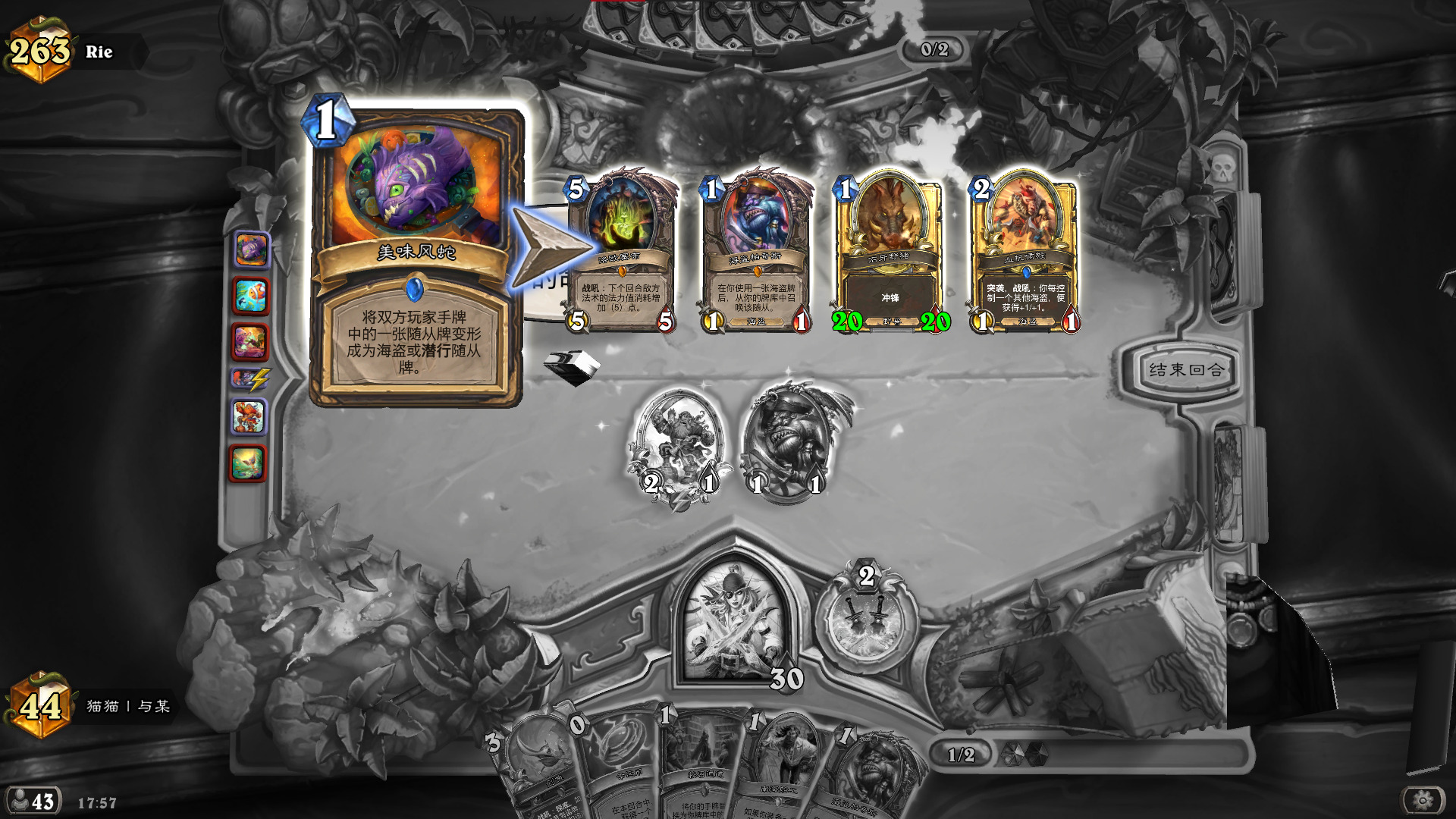 首先是通用留牌,对于所有对局,我们都需要留一张1费能出的小海盗,222海盗空降歹徒除了对阵术士要防亵渎造成亏牌,其他的对局都是必留的,再就是,3费挂刀是一个很重要的节奏点,起手在1费有怪下后,要尽力保证3费及以前能挂上刀,但是121锈水海盗的buff不用贪也很少能贪到(除非1费海盗2费231抽刀3费跳币秀水挂刀),为了保证2费有事做,在有231洞穴探宝者的情况下,我会把刀换掉,2费再抽上来。