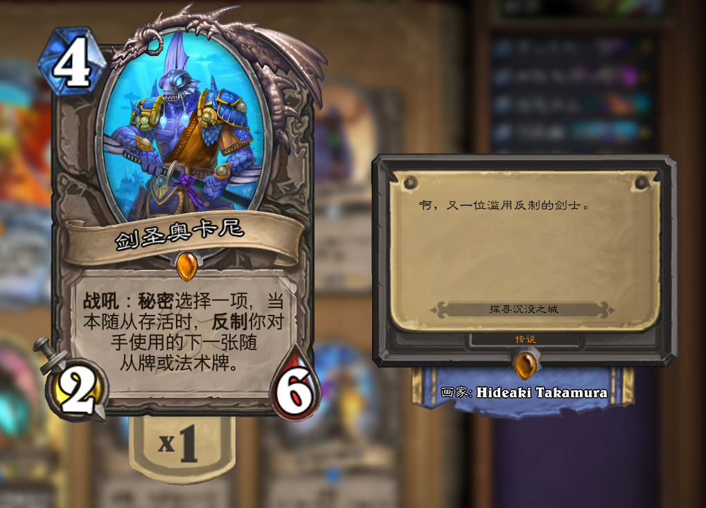 第四张,自然平衡召唤器 剑圣奥卡尼,针对凯子德,但是费用高,上限可以封不止一回合,下限一个自然平衡或者随心口袋找的小精灵,极不稳定,但是战吼灵活,如果要加入其他针对卡,我觉得可以换掉剑圣奥卡尼。(刺豚拳手)