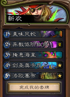 第一张,美味黑暗之主 美味风蛇,对付小德和牧师都有奇效(别想着机克,机克能抢死的),在你推理出小德手里有随从时(0费检索秒选一张抽不上来的牌的下一回合等,别的情况需要自己思考),或是对面黑猪牧使用了身材互换的下一回合,使用美味风蛇劝退你的对手!(或是变了黑暗之主劝退自己)