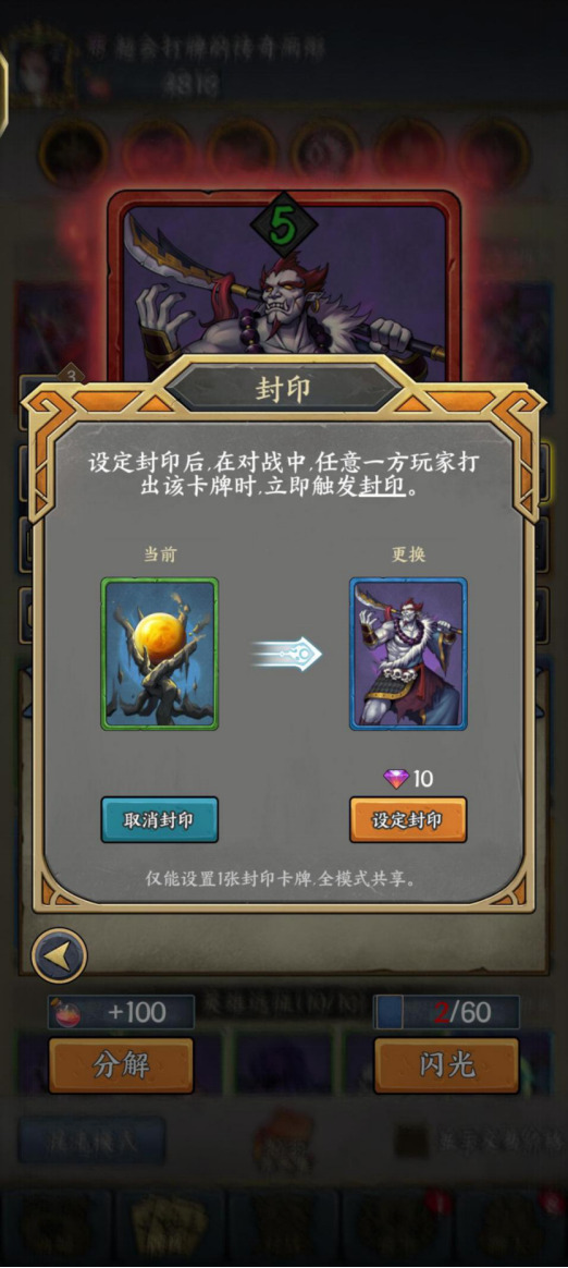 设定封印后,在对战中,任意一方玩家打出该卡牌后移除之,该玩家补1张牌。而且不会补到该卡,与好友约战时不会生效