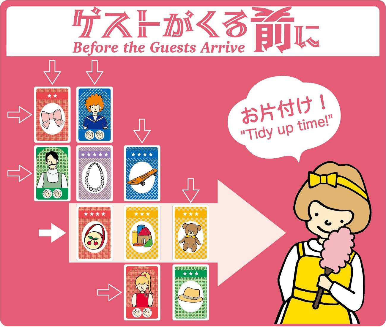 《Before the Guests Arrive(客人来之前)》,出版商Saashi & Saashi的新作(这家日本出版商的游戏全是这种清新简约的画风),一款简单的成套收集机制的卡牌游戏,在派对那天客人来之前,全家一起收拾乱七八糟的家。