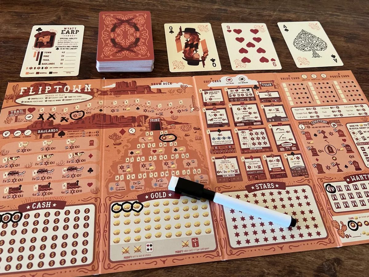 《Fliptown》是一款西部主题的纸笔类桌游,出自《无限都市》的设计师之手,本作使用标准的扑克牌以及可擦板来驱动一种开放世界风格的游戏。