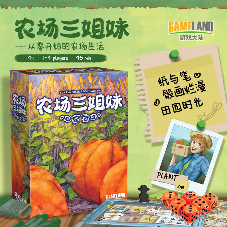 《农场三姐妹》是一款农场主题的骰写游戏,玩家将轮流选择骰子,在园子、养蜂场、工具棚与乡间集市中使用骰子赚取奖励,并栽种玉米南瓜豌豆花卉和水果,尝试在游戏结束时获取最多的分数。