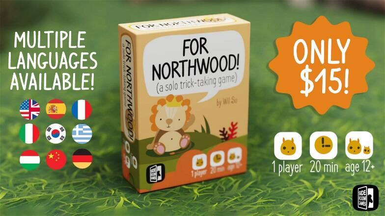 《For Northwood!》是一款单人吃墩类桌游,玩家需要在八个回合中访问八个动物封地,并与他们的统治者进行对话(吃墩),试图和平统一诺斯伍德王国。