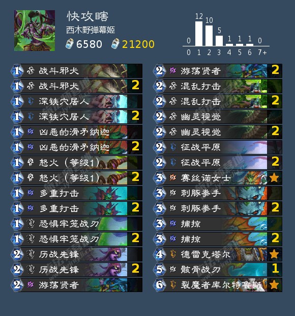留牌方面除去正常可以留的曲线生物外后手可以留赛丝诺女士和0费打3,以及刺豚拳手和多重打击的组合是在所有情况下都很优秀的,保证曲线的前提下恐惧牢笼战刃也是相当优秀的单卡。