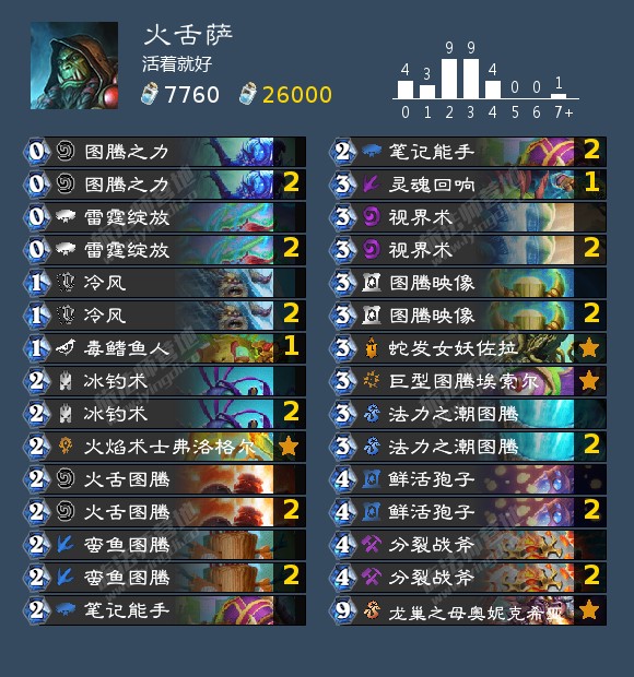 攻略就是起手找火舌,然后铺场,复制大量火舌,只用火舌影响的随从攻击,在合适的对手出现时,高攻就不要打脸了,这样可以多攻击几次。同时保护好自己的火舌,灵魂回响和鲜活孢子就是很好的选择,配合笔记能手,可以保住很长时间的火舌。蛇发女妖也是可以复制火舌的。分裂战斧还有图腾映象可以复制火舌。巨型图腾站住了,就可以让火舌存活率大增,但场攻高了也不好,所以是双刃剑,要根据情况早早送掉。