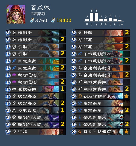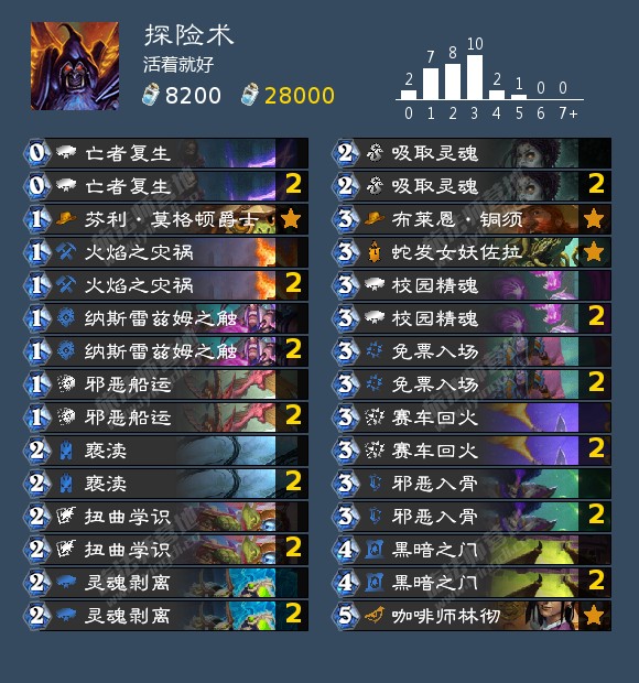 精英协会。使用150张探险家协会成员。探险家协会成员有铜须芬利雷诺和逐星。雷诺和逐星费用太高了,所以直接放弃,就用芬利和铜须就好了。然后就是铜须蛇法女妖咖啡师的组合无限复制回手就好了。成型后每回合都可以下一地芬利,记得清自己的场腾格子就好了。