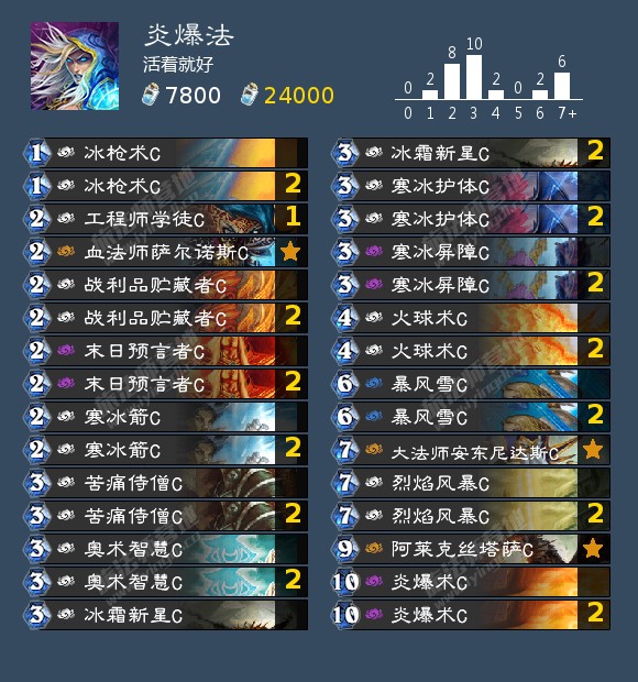 注意,致命灼热!使用炎爆术消灭你的对手30次。累积型成就,少用的专门去怀旧模式做的成就。毕竟炎爆术的强度实在太差劲了,还要10费,所以还是怀旧模式的强度最适合它的发挥了。上古冰法启动,作者我只有用系统的预组卡组把1个镜像换成第2个炎爆术就可以排天梯了。上古冰法还是给力,吊打脚本和动物园,基本上都是冰冰冰,过过过,9费红龙喷脸,10费红龙踢脸炎爆斩杀。要不血量健康,就连续2个炎爆斩杀对手。怀旧模式就照明弹可以破冰箱,而且也没人带,所以冰箱一挂太安全了。